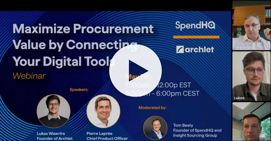 On our recent webinar, Pierre Laprée joined Tom Beaty, Found of Insight Sourcing, and Lukas Wawrlra, Founder of Archlet, to discuss the benefits of building a custom digital procurement ecosystem by connecting best-of-breed procurement solutions.